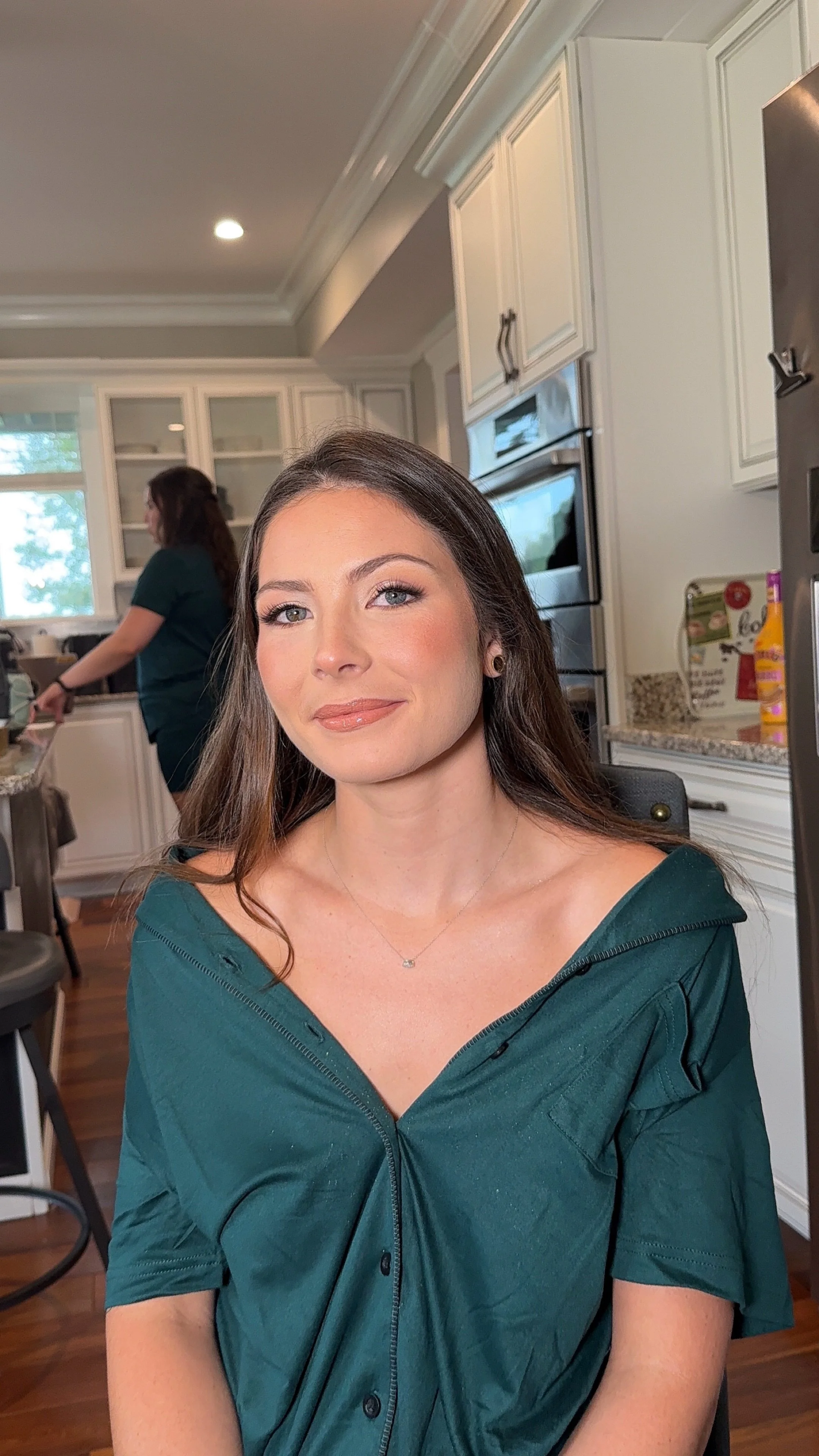 Close-up of a smiling person with styled hair and earbuds, in a makeup setting with a blurred background.